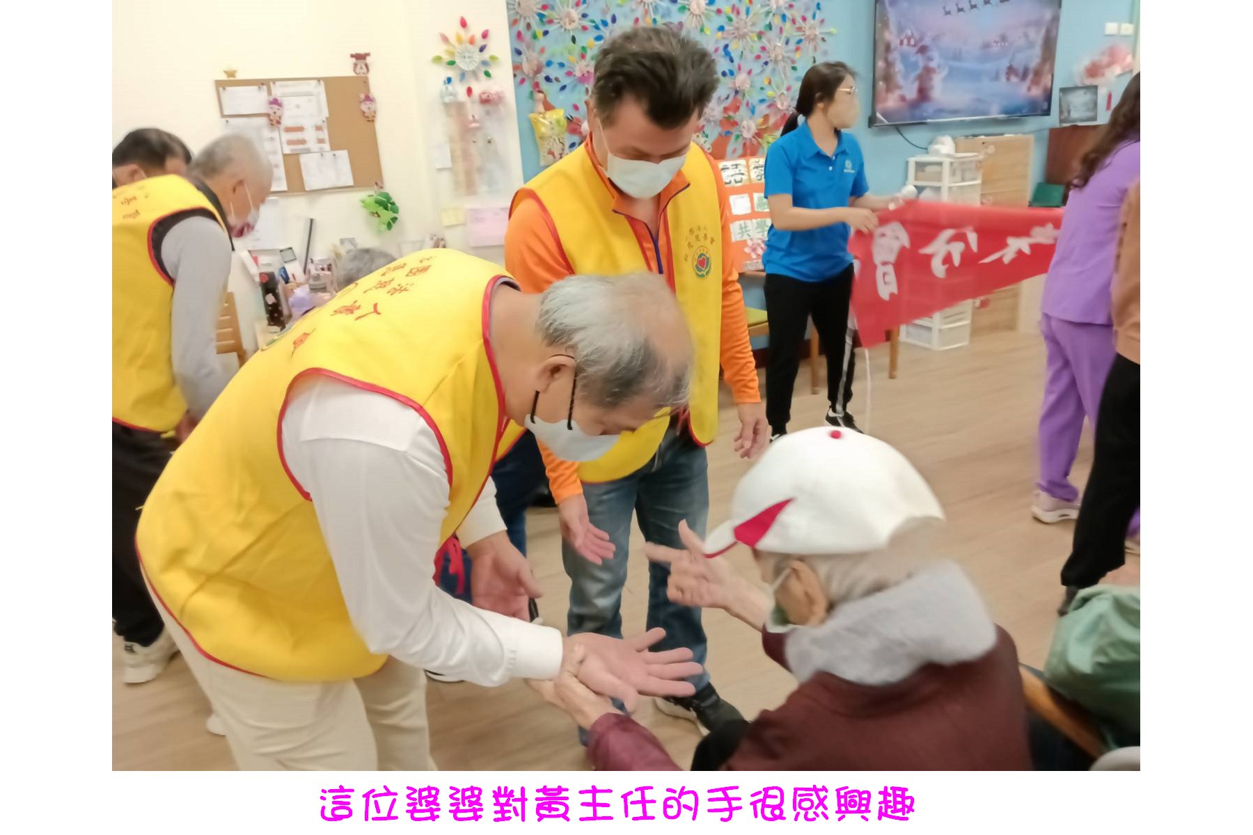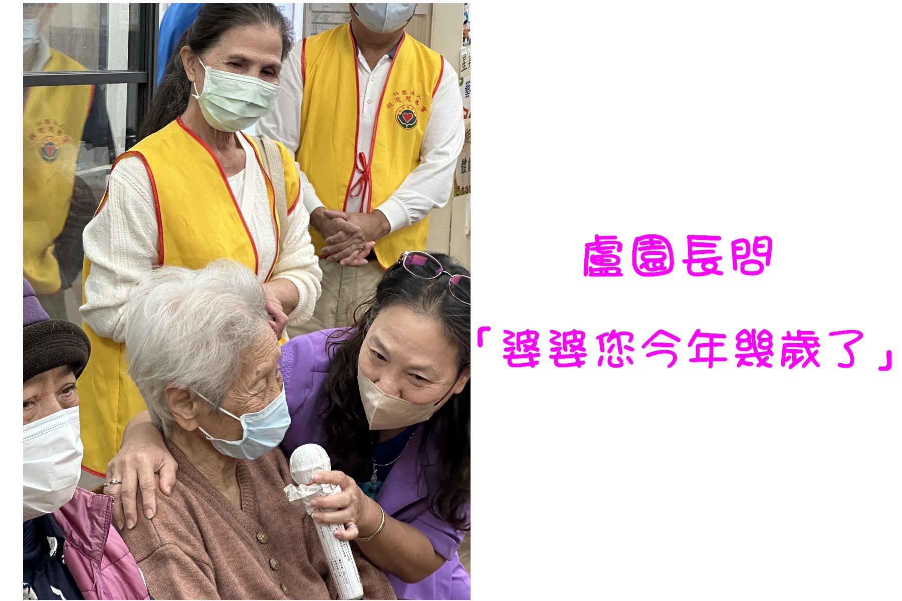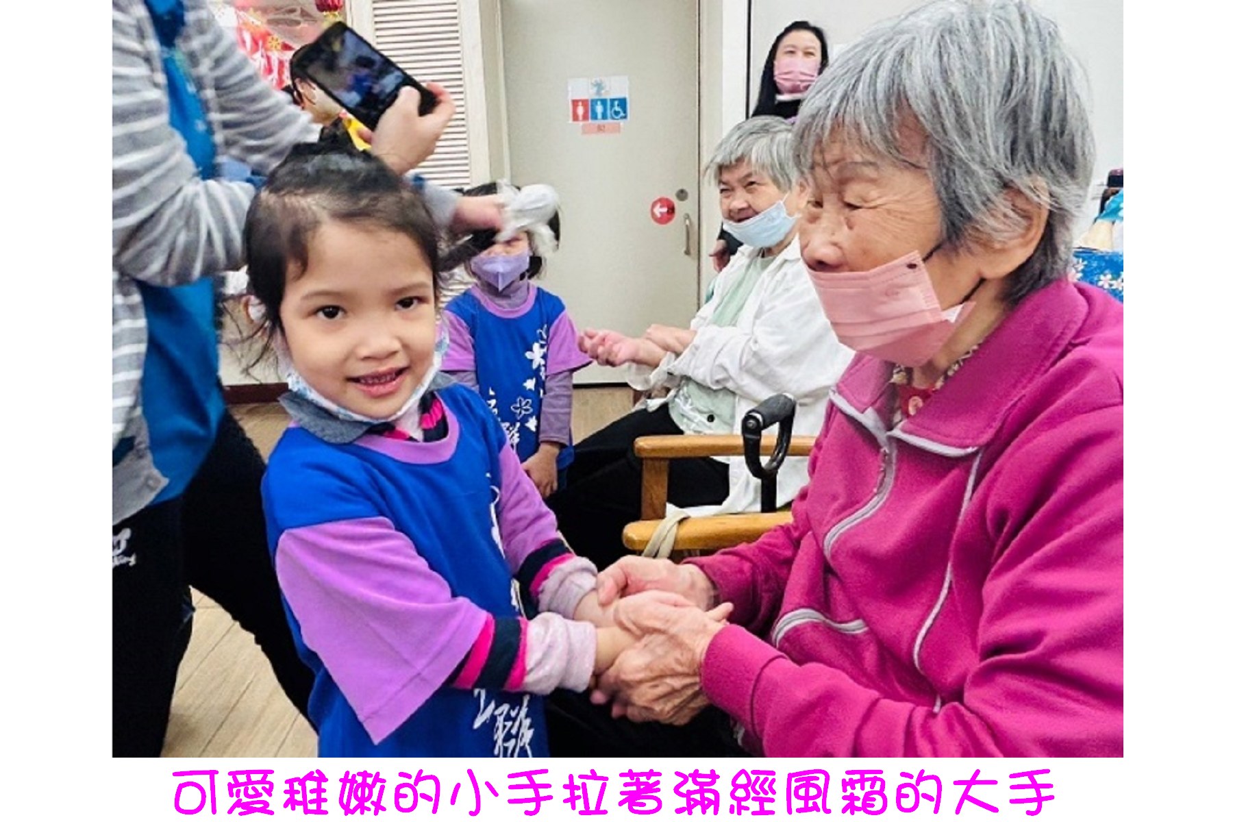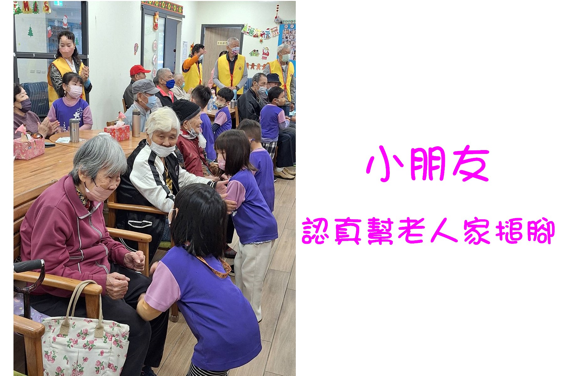 「炒蘿蔔、炒蘿蔔、切切切……包餃子、包餃子、捏捏捏……」,可愛稚嫩的小手拉著滿經風霜的大手,又唱又作,雖然都戴著口罩,仍可見一雙雙慈愛的眼看著純真的童顏,露出歡喜的神情。「火車來了,嘟--嘟--,汽車來了,叭--叭--,飛機來了,咻-----」,連志工們也跟著嘟嘟嘟、叭叭叭唱和了起來。帶隊老師拿著麥克風親切訪問長者們:「婆婆,請問您叫甚麼名字?」「陳ΟΟ」,「小朋友,跟陳婆婆打招呼」「陳婆婆好」「陳婆婆今年幾歲了」「90歲」「小朋友90歲很多喔,九個十喔!小朋友為陳婆婆掌聲鼓勵」。氣氛熱絡中,志工們也藉此認識長者們。