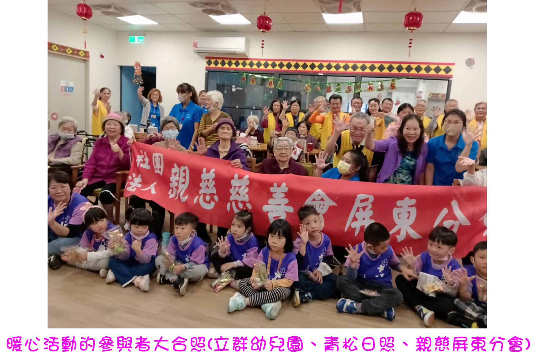 聽理事長說,這次老、中、幼共同歡樂的活動,是由98組盧重枝委員提議,帶領其幼兒園師生到青松日照中心,老師們指揮小朋友與老人家帶動唱。而由前主任黃豐霖與曾蕰發主任號召的親慈志工們,來此與老人家互動同樂。看到活動中的溫馨畫面,感覺非常暖心,希望未來能有更多機會參與。
