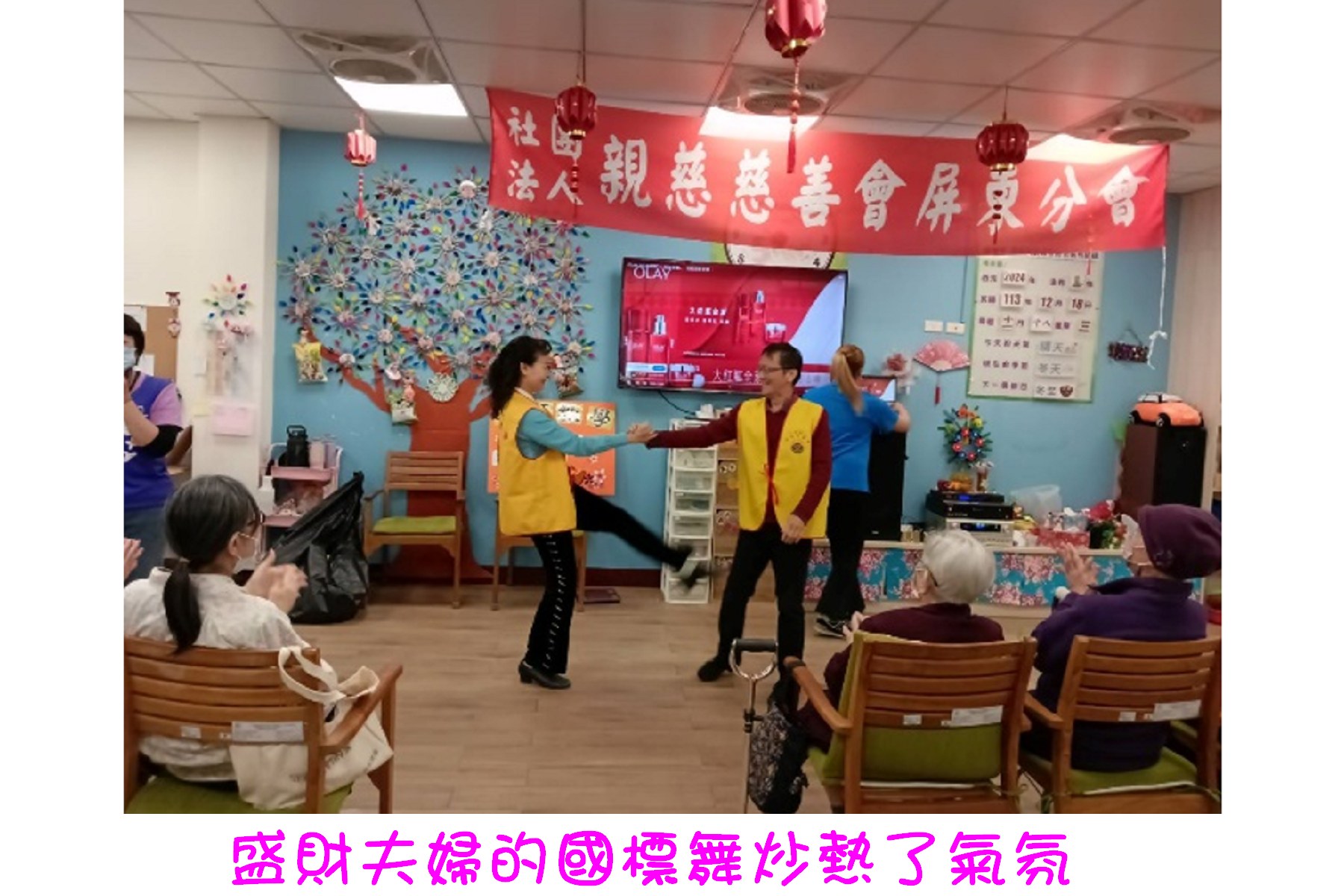 「岷江夜,恍如夢,紅男綠女互訴情衷……」,隔壁教室傳來岷江夜曲的歌聲,歌聲停止後是歡呼聲,夾著丹田有力的「ㄤ扣ㄤ扣」聲,好奇一探,原來是志工盛財夫婦隨興來了一段國標舞,成了另一段高潮,兩夫妻應觀眾要求再來一曲。我看到最前排坐輪椅戴著鴨舌帽的婆婆,瘦癟的雙手隨著音樂大力打著拍子的樣子,可感覺她的興奮,雖然那雙手因手肘靠著輪椅的扶手,以致雙掌不易確實擊出聲音,但她仍奮力搖晃著雙手,融入現場氣氛、沉醉在樂曲中。
